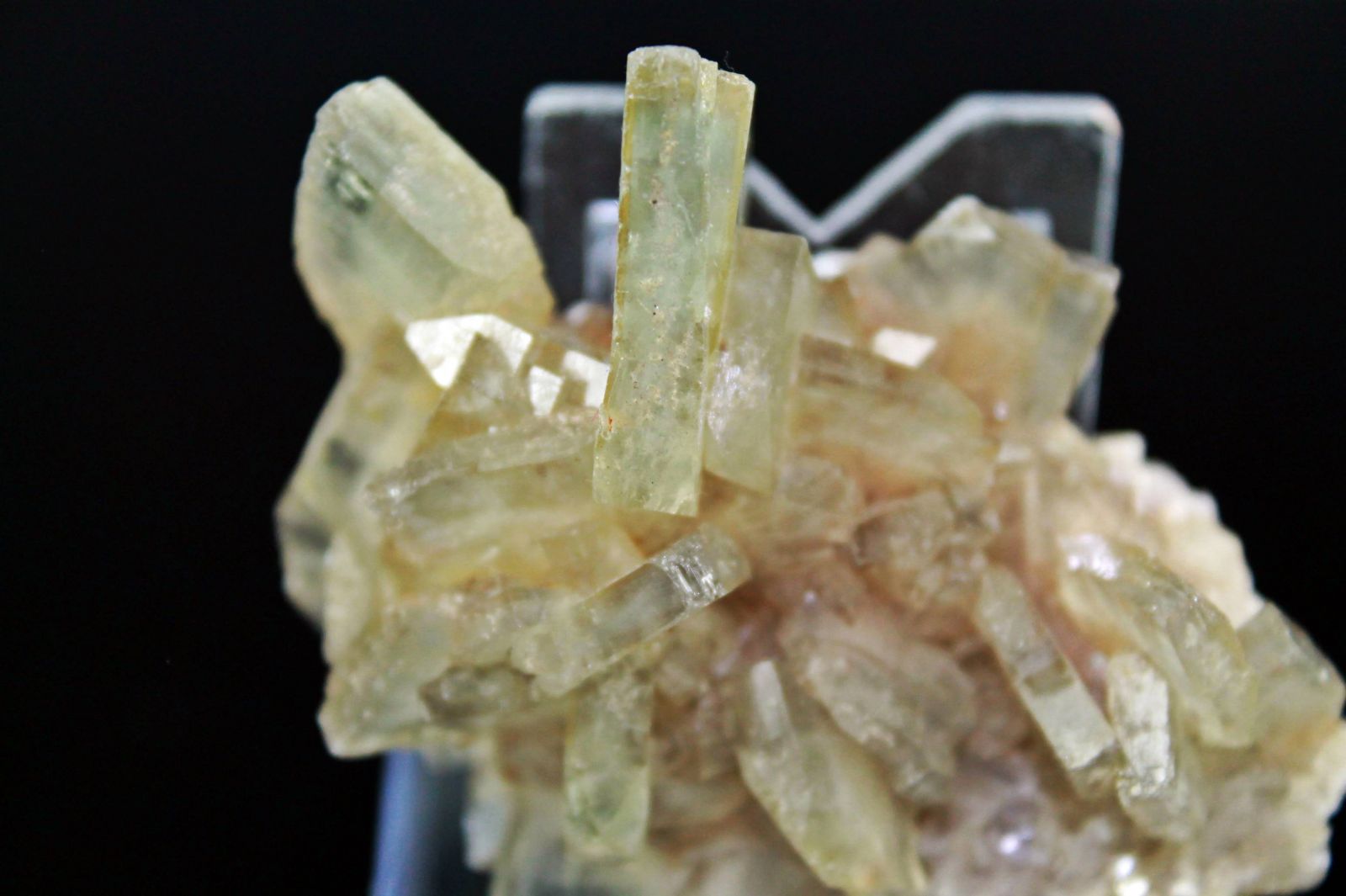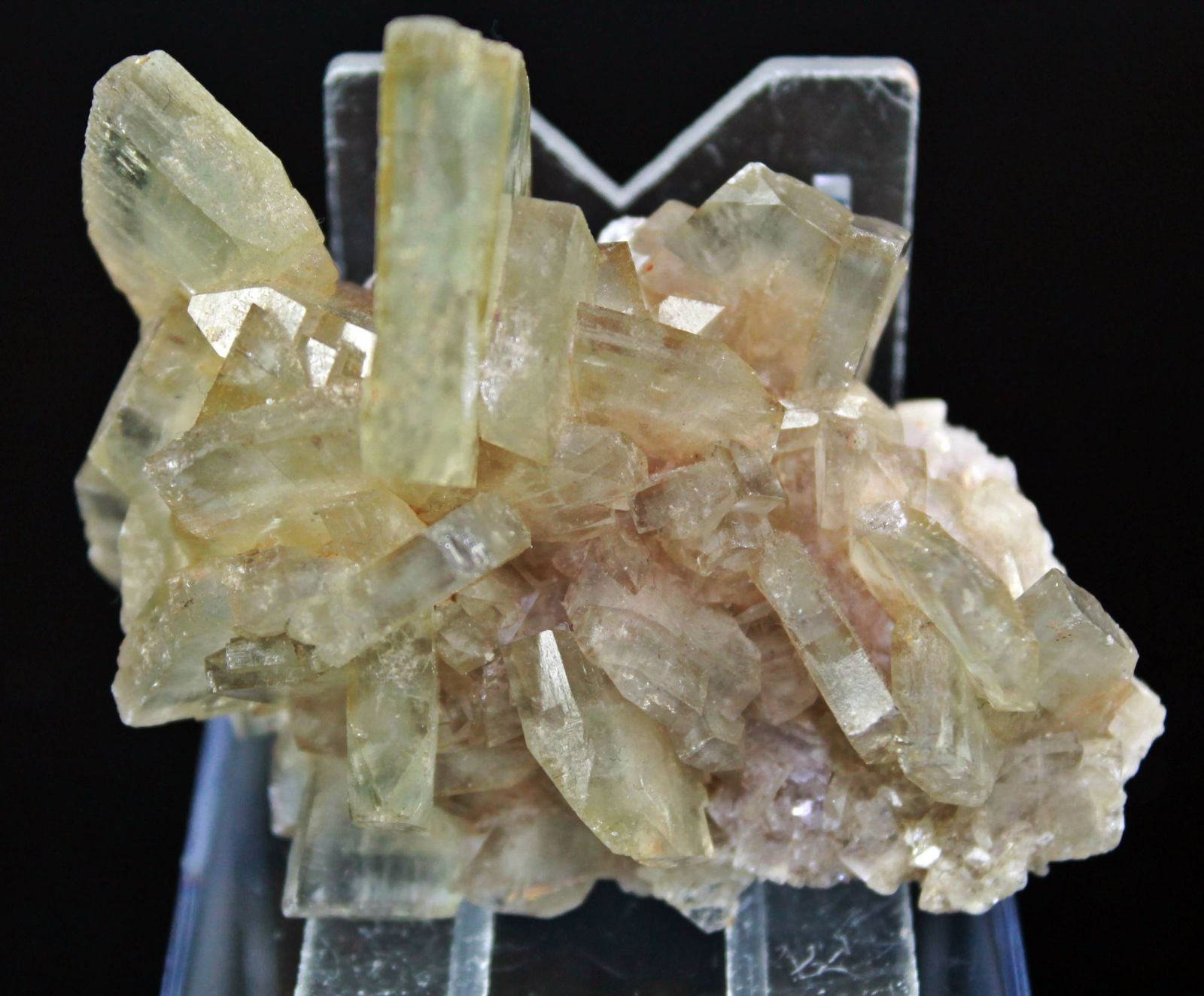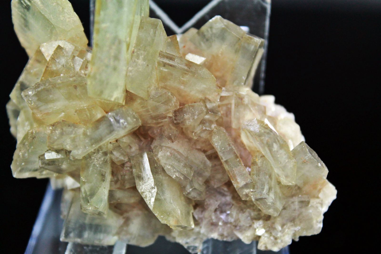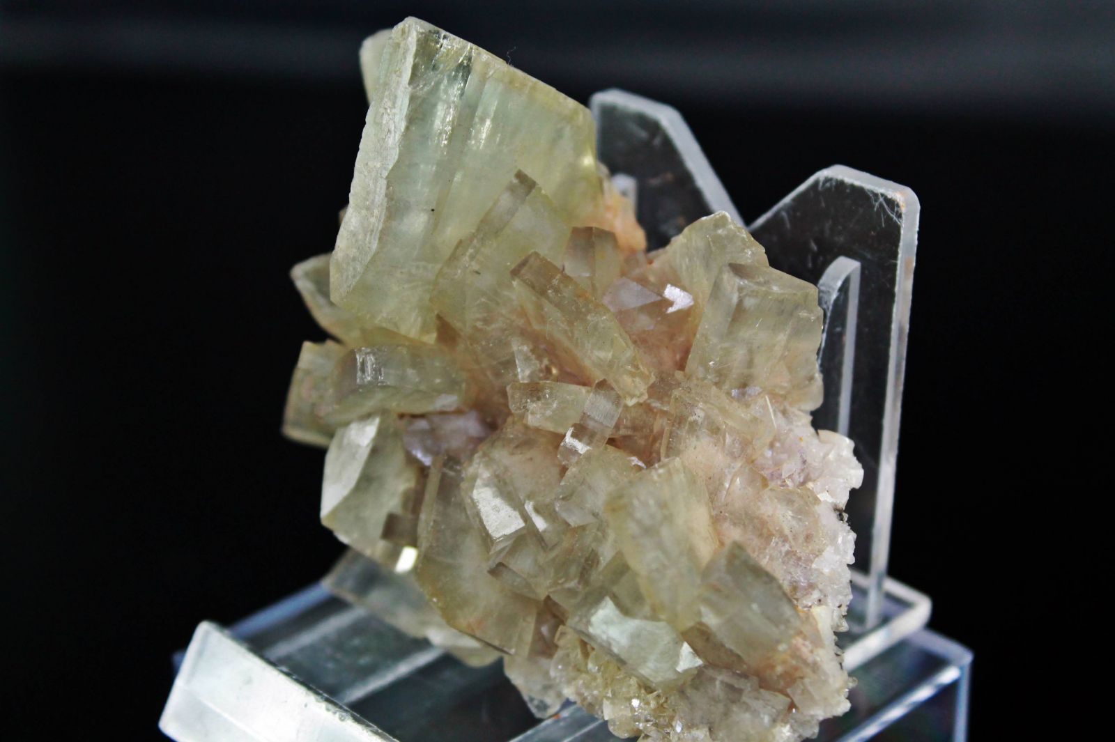Grupo de cristales de barita, de color azul-verdoso. Color raro en el yacimiento.